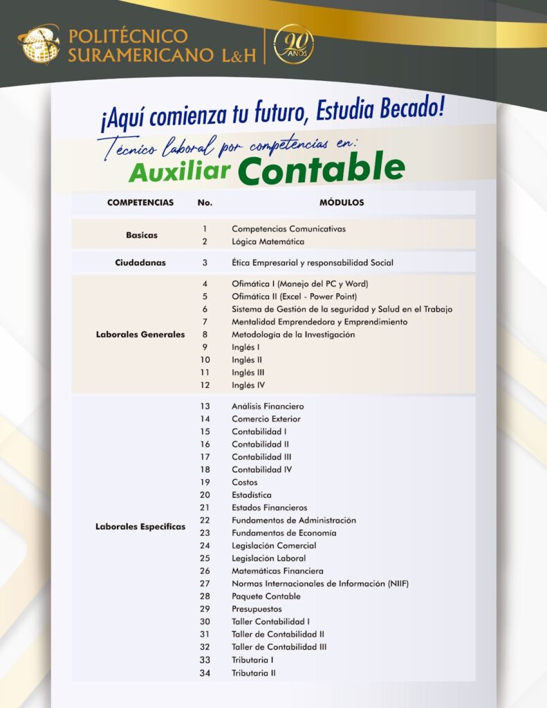 El perfil del Técnico Laboral por Competencias en Auxiliar Contable, nuestros egresados estarán en la capacidad de fortalecer los procesos empresariales y operativos, debido a sus funciones y conocimientos relacionadas con la gestión contable.